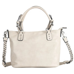 The Ella Tote by Lady Conceal boasts faux leather, accented with silver studs and a stylish braided cross-body strap. Inside, find a zippered pocket, 2 open slip pockets, a large open pocket, and a leather key strap for easy access to your keys. Enjoy versatile carrying options with two handles or an adjustable shoulder strap. The adjustable cross-body strap easily clips on and off and measures 34โ- 45โ (drop 17โ - 22โ).