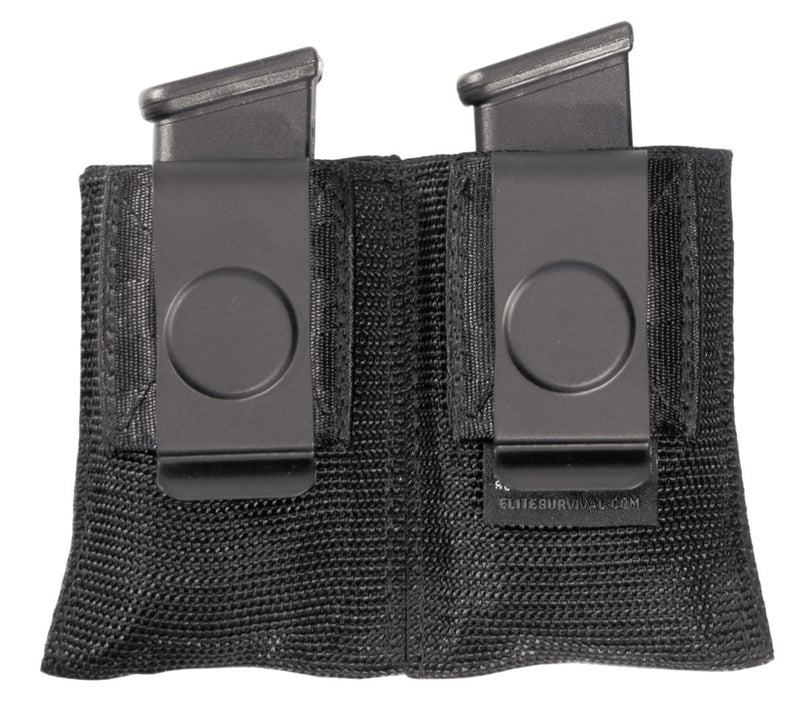 The IWB double magazine holster holds two and is designed to be worn inside the pants. This double mag pouch is constructed of heavy-duty webbing with dual steel spring clips. Clips fit over belts up to 2.25" wide. This IWB double magazine holster is made in the USA. We also sell this double mag design as a single IWB mag pouch.