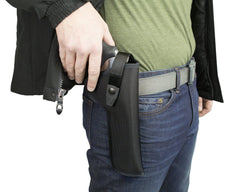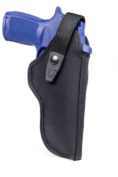 The Elite Survival Systems Dura-Tek Hip Holster is a great solution for outside-the-waistband retention for handguns. It is constructed of dense, padded ballistic nylon with an injection-molded polymer belt panel to fit from 1-2" wide belts. This hip holster design provides a maximum coverage and a closed bottom to better protect the weapon. Its SightStrip™ provides protection to the front and rear sights, and the snap retainer strap is adjustable with hook and loop. Dura-Tek hip holster sizes are available to fit most pistols and revolvers.