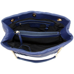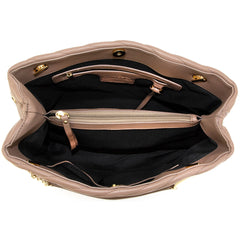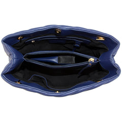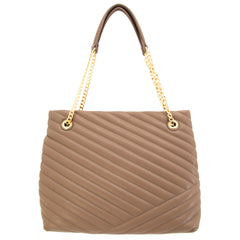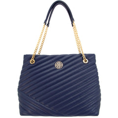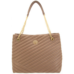 Flora is vegan leather, quilted tote featuring an open-top with snap tab closure and gold medallion detail. It has parallel, vegan leather handled, curb chain straps, and expanding side panels with snaps.