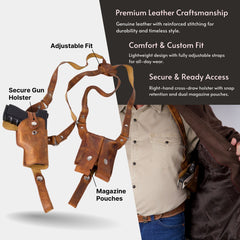 Engineered for durability, comfort with a classic style, this leather shoulder holster is designed to keep you ready and secure in any situation. The lightweight design reduces bulk for extended wear, while fully adjustable straps ensure a custom, balanced fit for all-day comfort.
